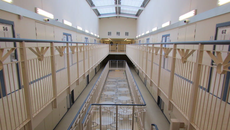 The prison holds almost 1400 male adults and 64 young offenders under the age of 18 in its separate juvenile unit. The extension of three wings around a central core consists of 216 cells, 45 built to accommodate a single occupant, and 171 built to accommodate two occupants.