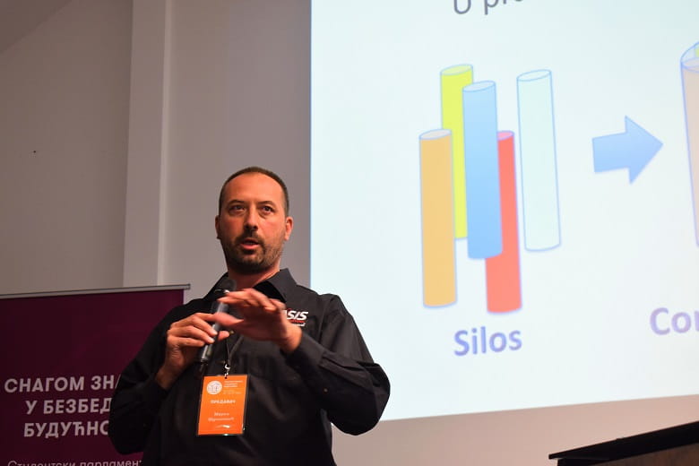 Marko Šukilović je, u prvom delu predavanja, govorio o pristupu G4S Akademije koji je naša kompanija razvila na globalnom nivou, ističući da ona stvara inteligentnu kulturu, izaziva tradicionalne načine razmišljanja, prihvata i prilagođava se promenama u tehnologiji i predviđa buduće bezbednosne zahteve korišćenjem sopstvenog znanja i deljenjem tog znanja (sa klijentima). O našoj G4S Akademiji više možete pročitati ovde.