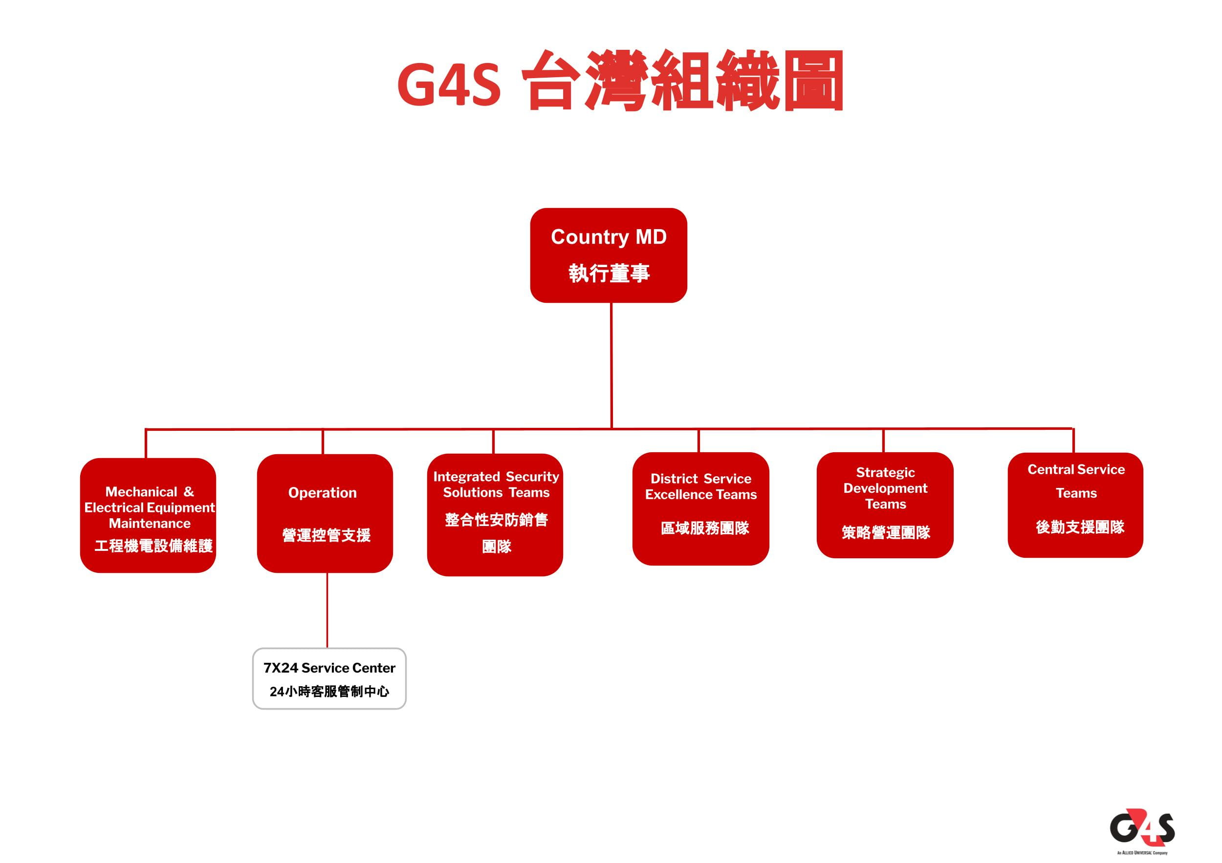 G4S台灣於台北、林口、桃園、新竹、台中、台南 、高雄皆設立營業據點辦公室;其台灣員工人數超過3,000名,轄下共有6家公司,含管理顧問、綜合性物業服務、警衛臨勤服務、整合性安防系統規劃和建置、停車場經營業務…等全方位服務